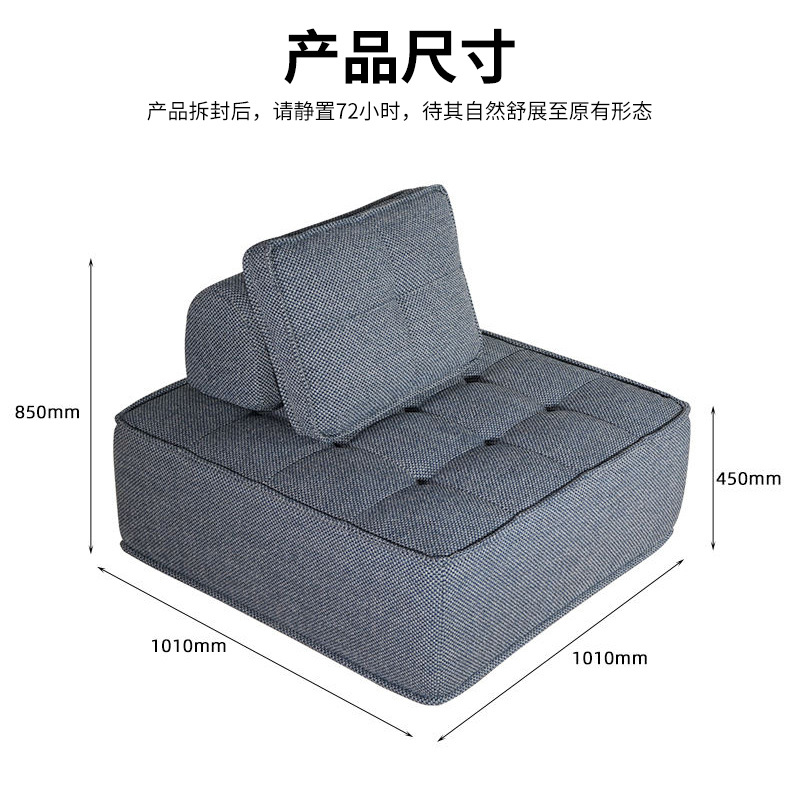 作为 “懒人专属”,沙发填充高密度回弹海绵,座包厚实饱满,坐感软糯却不失支撑,葛优躺、盘腿坐等姿势都能贴合腰背曲线,缓解全身疲劳。模块化设计赋予其超强灵活性:单模块可作客厅休闲椅,搭配脚踏打造阅读角;移至卧室可当睡前休憩位,小户型也能实现 “一椅多用”。落地式结构无需安装,拆封即放,底部平整稳固,扫地机器人可自由穿梭清洁。