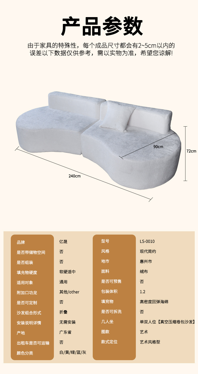 针对跨境运输需求,沙发采用真空卷包压缩工艺,压缩后体积大幅缩减,不仅降低物流成本,还方便搬运入户,哪怕是狭窄楼道或小户型也能轻松通过。拆封后解除真空包装,静置数小时即可恢复蓬松形态,无需专业安装,省时又省心。无论是打造奶油风客厅的核心家具,还是为居家空间增添舒适休闲区,这款沙发都能兼顾颜值、舒适与实用性。